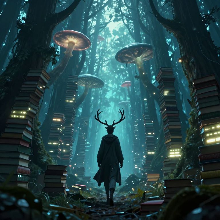 In a surreal, cyberpunk-inspired digital artwork, a figure adorned with majestic antlers strolls through a mystical forest where towering stacks of books form the trees, their glowing spines casting an ethereal, bioluminescent light reminiscent of otherworldly fungi.