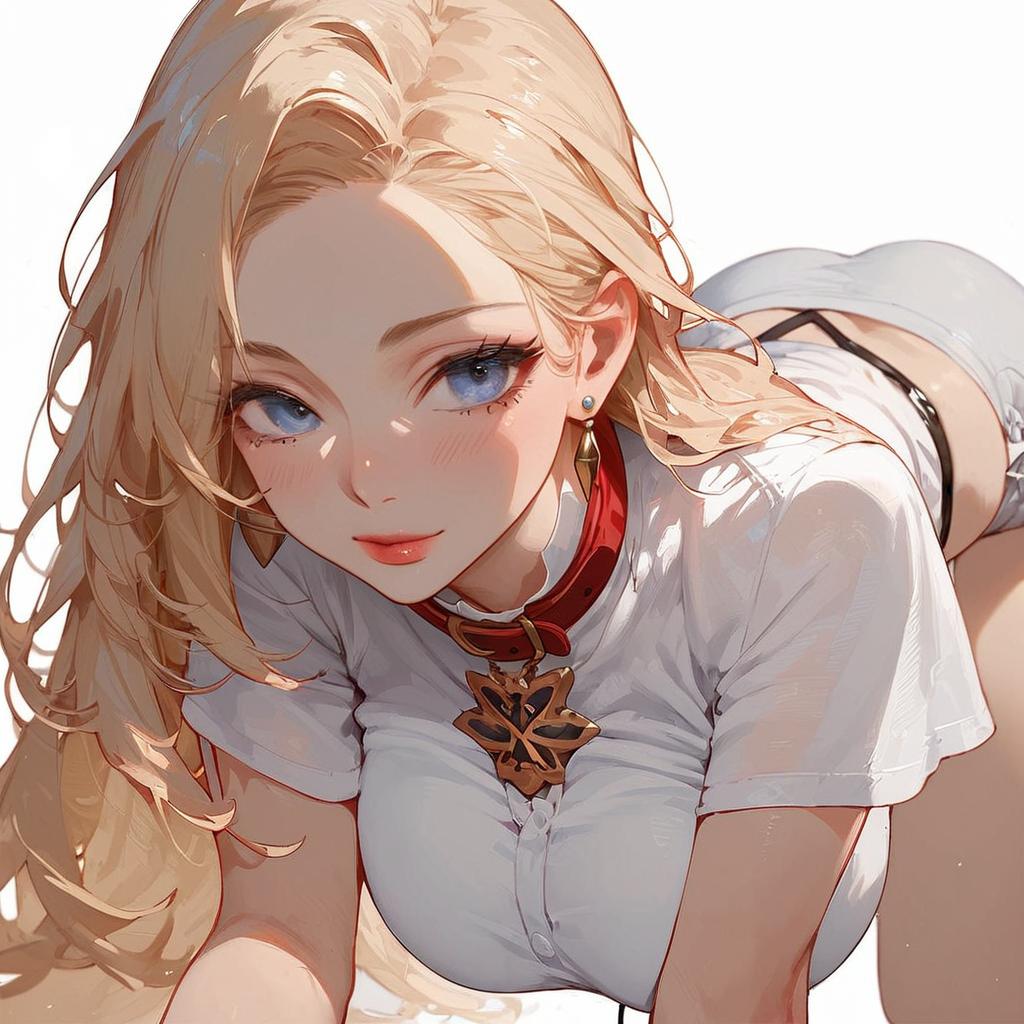 Score_9, score_8_up, score_7_up, score_6_up, score_5_up, score_4_up, beautiful woman, white background, lineart, source_anime, smooth outline, blonde hair, white shirt, stationary restraints, all fours, wrist cuffs, collar, facing viewer, looking at viewer, close-up