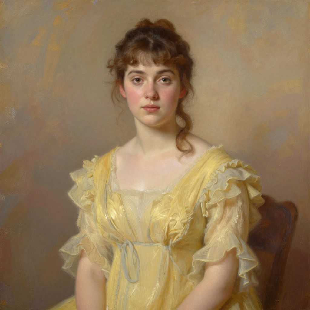 Classical portrait painting of a young woman with fair skin, brown hair, and blue eyes, wearing a yellow, ruffled dress against a beige background