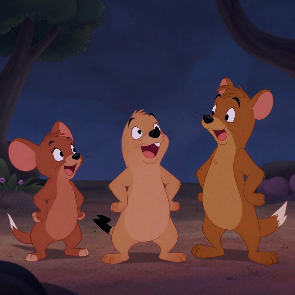 A digital animation from the classic "The Adventures of Tom Sawyer" series features three anthropomorphic mice standing on a dirt path at night. On the left, a small brown mouse with large ears and a cheerful expression stands with hands on hips. In the center, a slightly larger beige mouse with a wide smile and hands on hips looks up. On the right, a taller brown mouse with a friendly grin and hands on hips faces forward. The background is a dark, forest-like setting with trees and a blue twilight sky. The mice have expressive, cartoon-like eyes and exaggerated features.