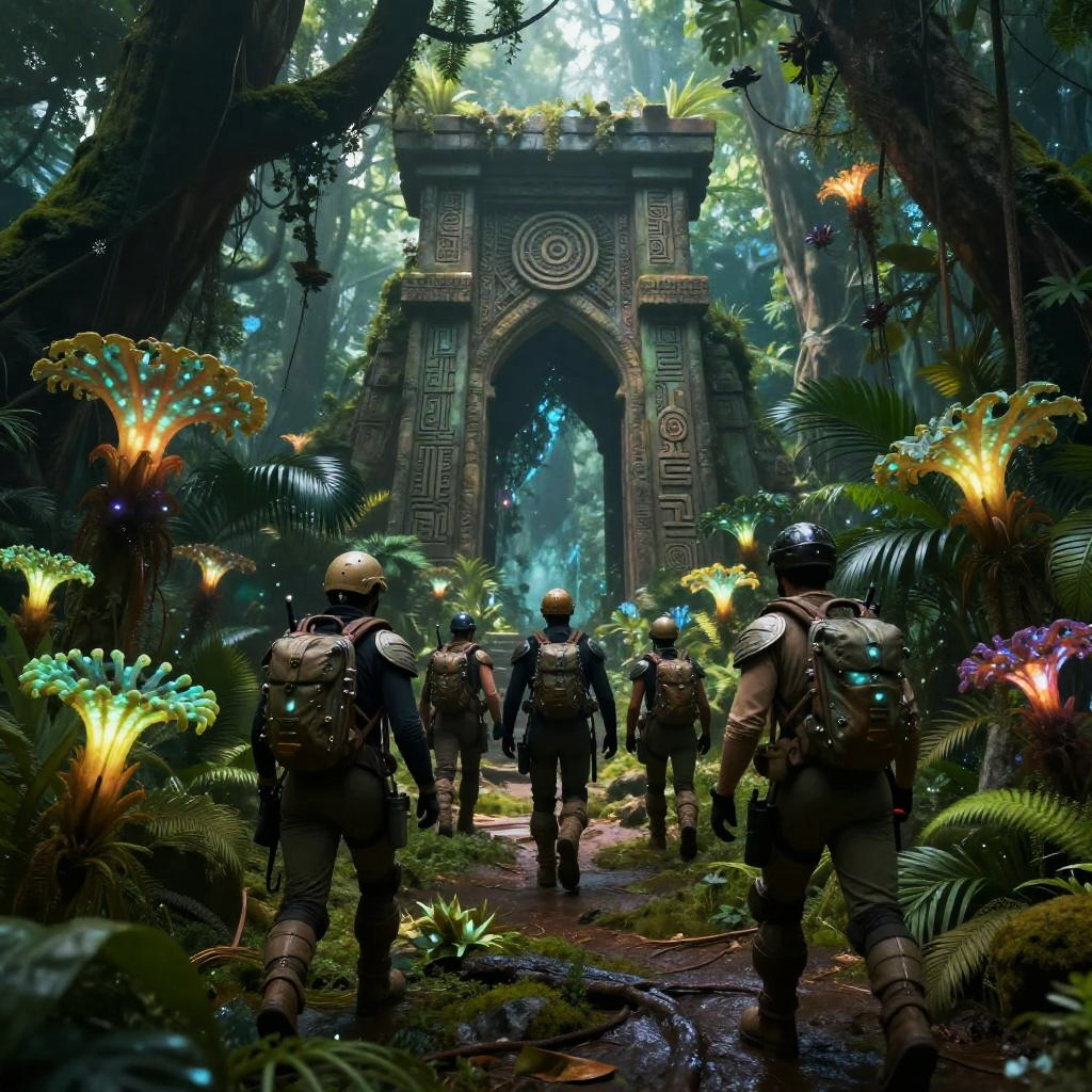 NRP expedition team exploring an alien jungle, bioluminescent plants casting soft glows on armored explorers, mysterious ruins in the background with strange symbols, rich greens and dark shadows, dynamic composition showing adventure and discovery