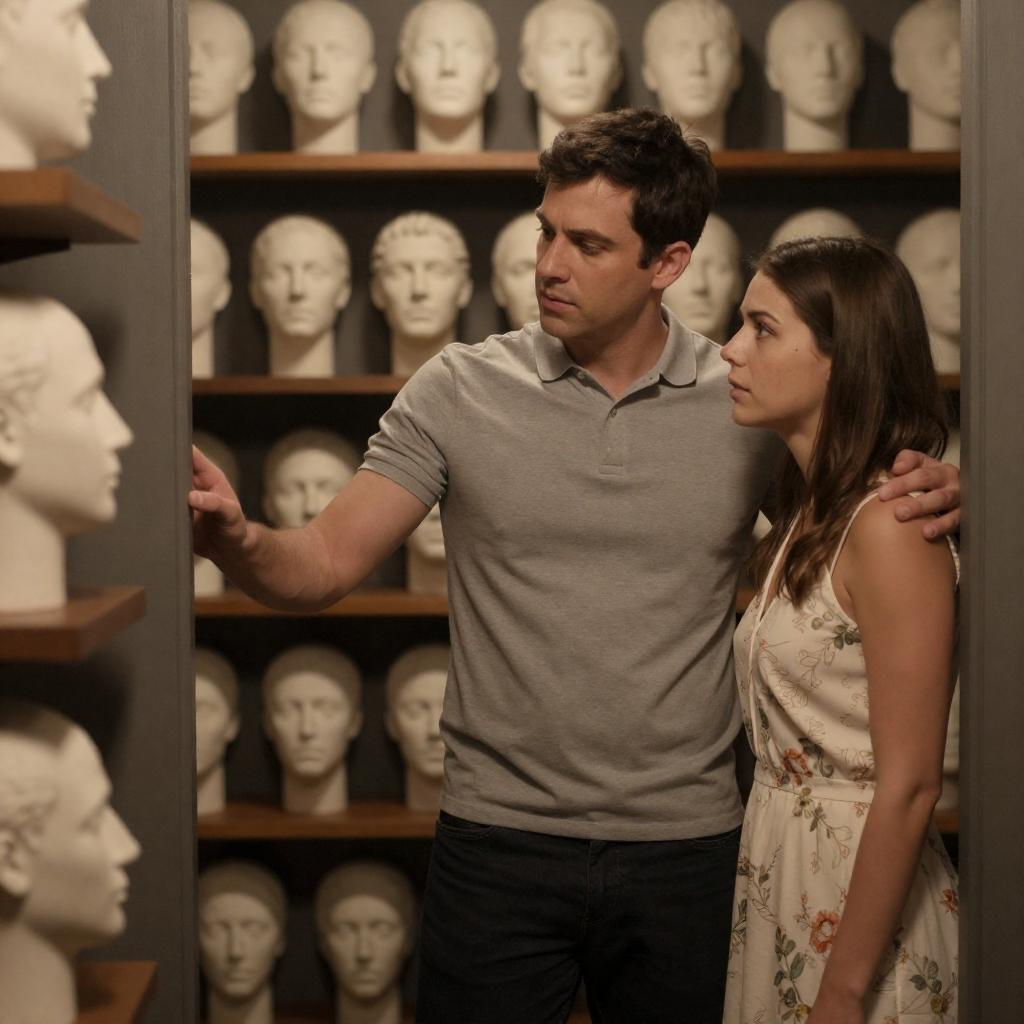 Photograph of a man and woman in a dimly lit room filled with numerous sculpted human heads. Man in gray polo shirt, dark pants, medium build, short dark hair. Woman in white floral dress, brown hair, reaching for door. Man's expression is cautious, woman's is concerned. Shelves of heads in background. Man's hand on woman's shoulder. Warm, muted lighting.