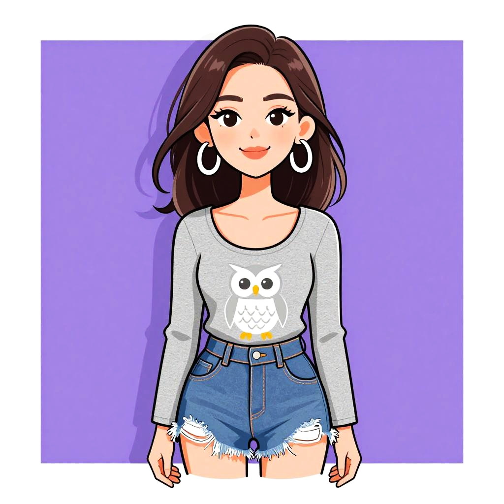 Digital illustration of a smiling young woman with brown hair, wearing a white owl crop top, blue denim shorts, hoop earrings, and a black shoulder bag