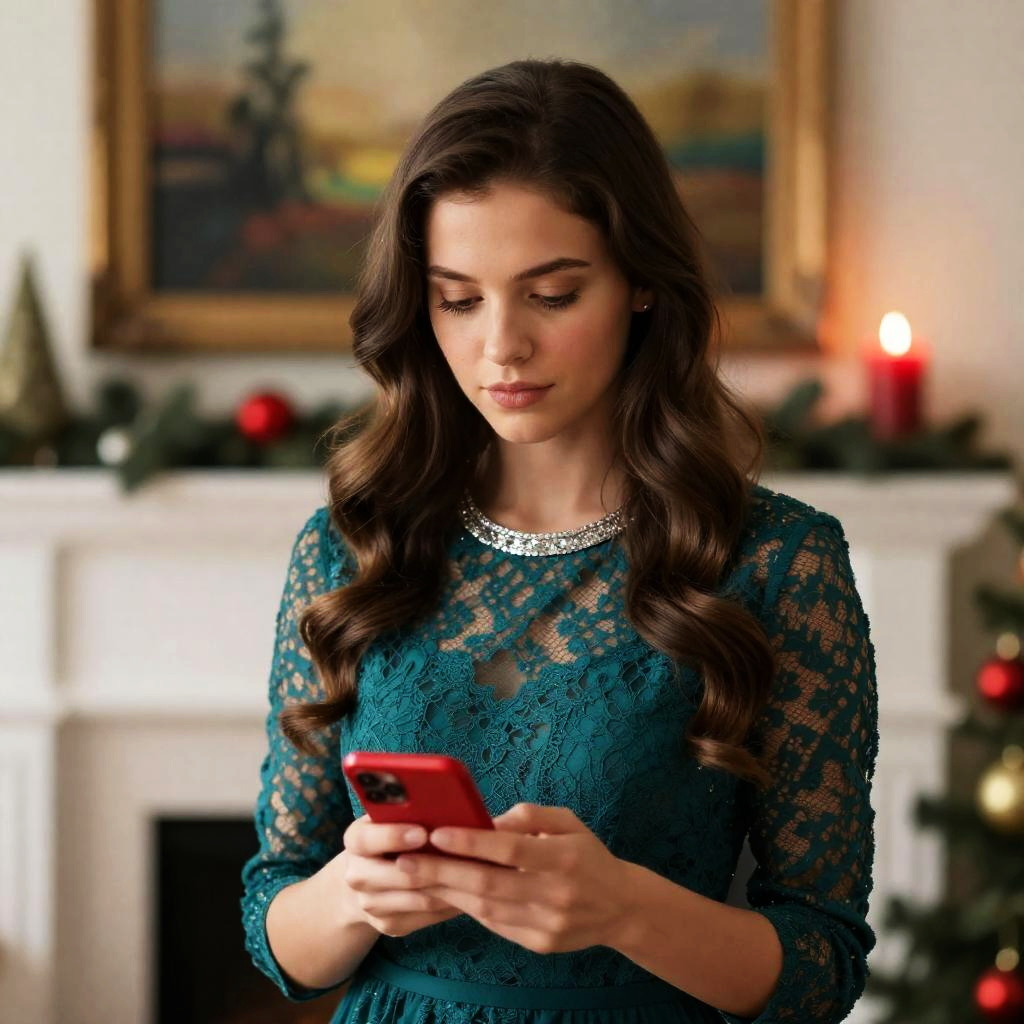 Photograph of a blonde woman with fair skin and a slim build, wearing a deep red velvet dress with a plunging neckline, focused on her smartphone. She stands in a dimly lit, elegant room with blurred hanging lights and dark curtains in the background. Her hair is styled in a loose updo.