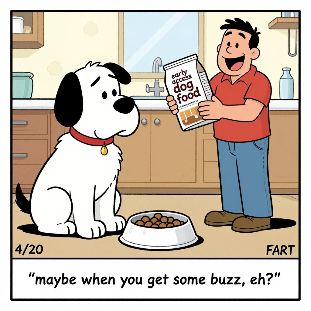 Marmaduke cartoon featuring a large dog sitting next to an empty dog food bowl in the kitchen, The dog is looking sadly and longingly at a bag of dog food being held by a man on that is labeled \"early access dog food\", The person is visibly laughing, There is text at the bottom of the screen that says in quotes “maybe when you get some buzz, eh?”, The date “4/20” and the signature “FART” are also present in one corner of the comic strip panel