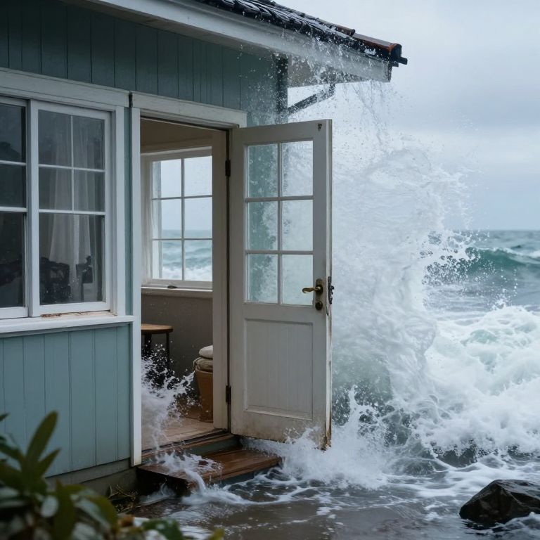A house is being engulfed by a massive ocean wave, with water rushing through the open door and windows.