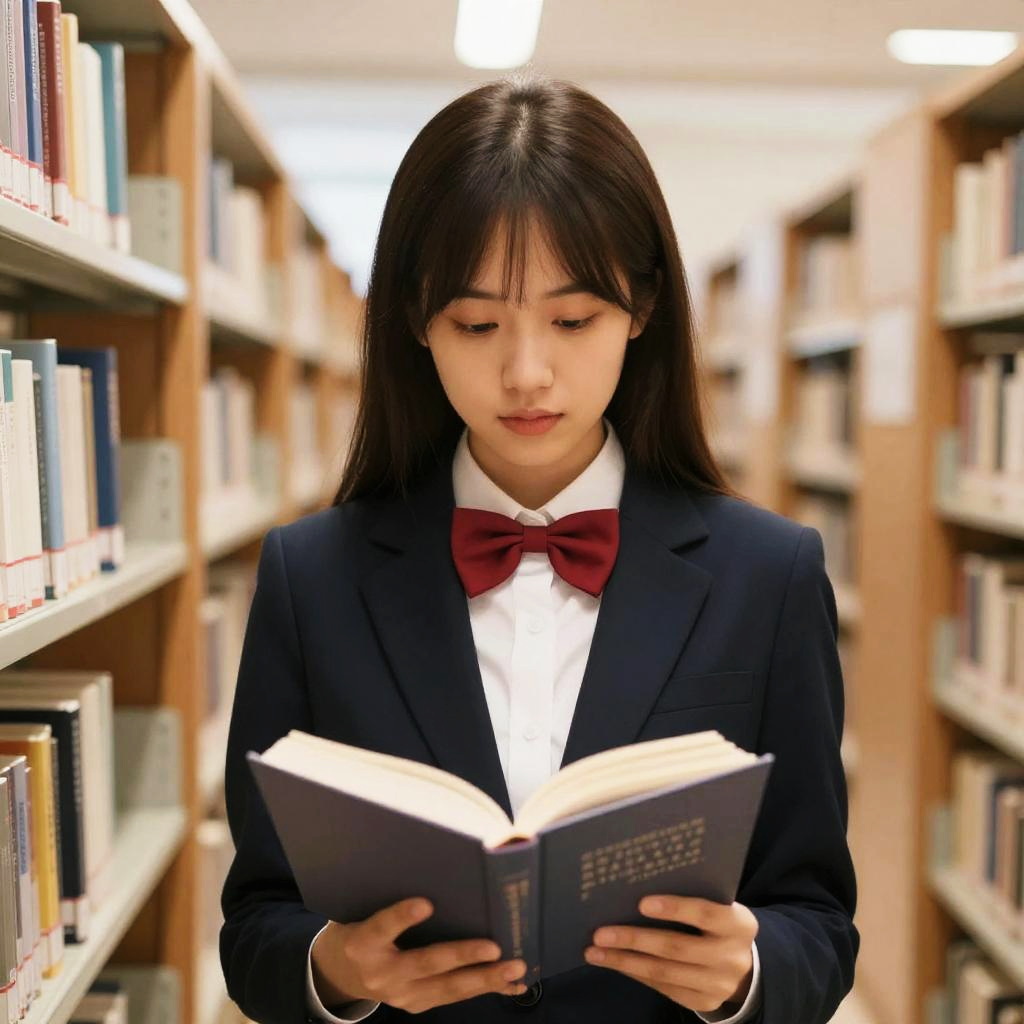 Woman Reading in Library with Bow Tie