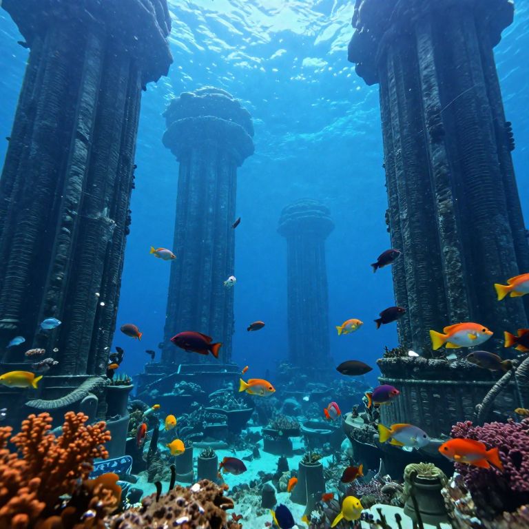 A mesmerizing underwater realm where schools of vibrant fish navigate through towering, ancient columns that pierce the depths like a submerged metropolis, defying the boundaries between architecture and nature.