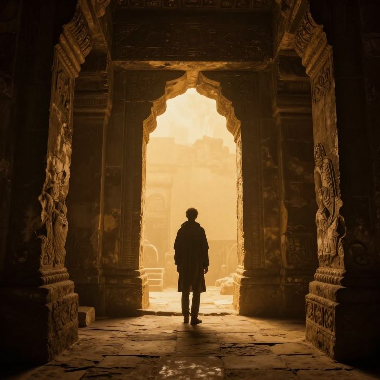 Photograph of a silhouetted figure standing in a glowing, ornately carved stone archway, bathed in warm, golden sunlight.