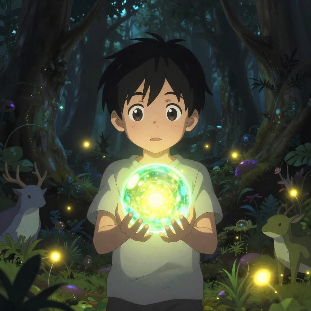 Anime kid black hair holding a magical glowing orb in a dark enchanted forest, surrounded by mystical creatures and fireflies, soft glowing lights and detailed foliage, fantasy anime style with high contrast and atmospheric mood