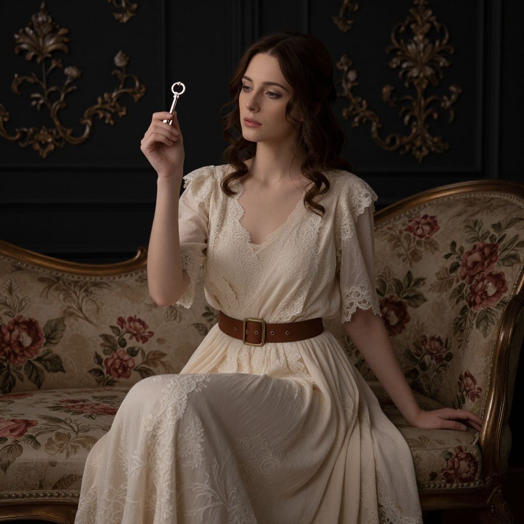 Photograph of a fair-skinned, brunette woman with wavy hair, sitting on a floral-patterned, vintage sofa. She wears an ivory, lace-trimmed, V-neck dress with short sleeves, cinched with a brown belt. She holds a small, antique key in her right hand, raised slightly. The background features dark blue, intricately patterned wallpaper. The lighting is soft, highlighting the delicate textures of her dress and the floral upholstery. Her expression is thoughtful, and the overall mood is vintage and elegant.