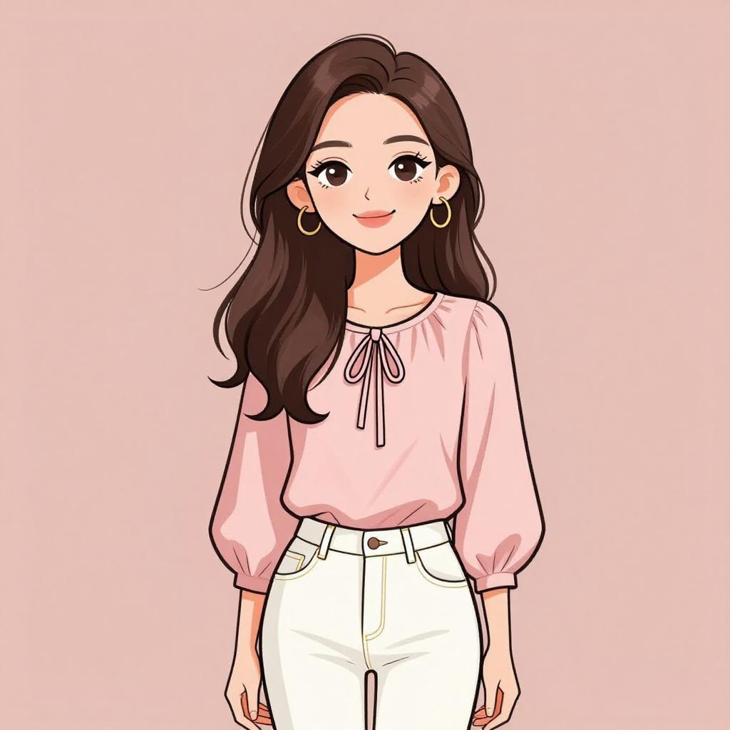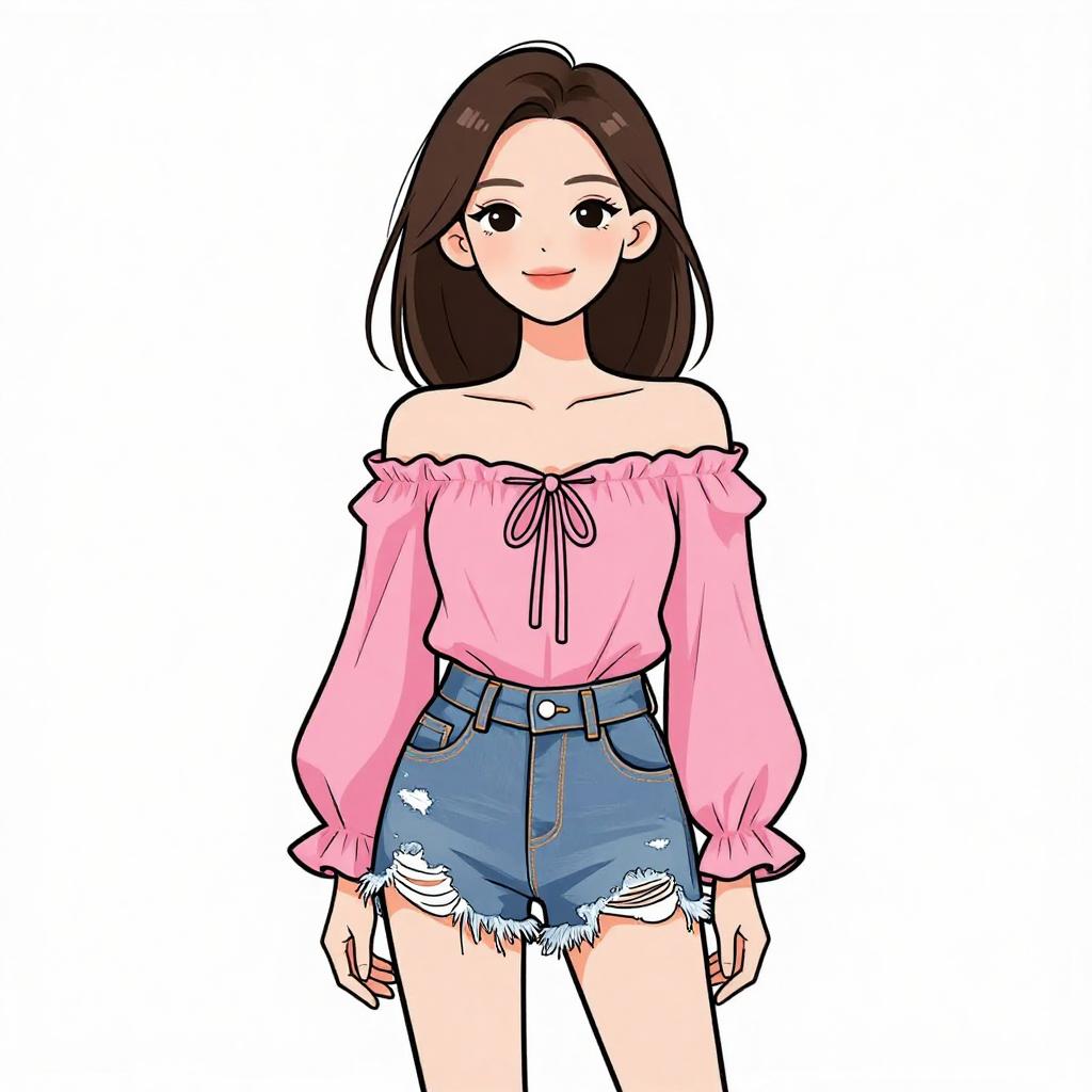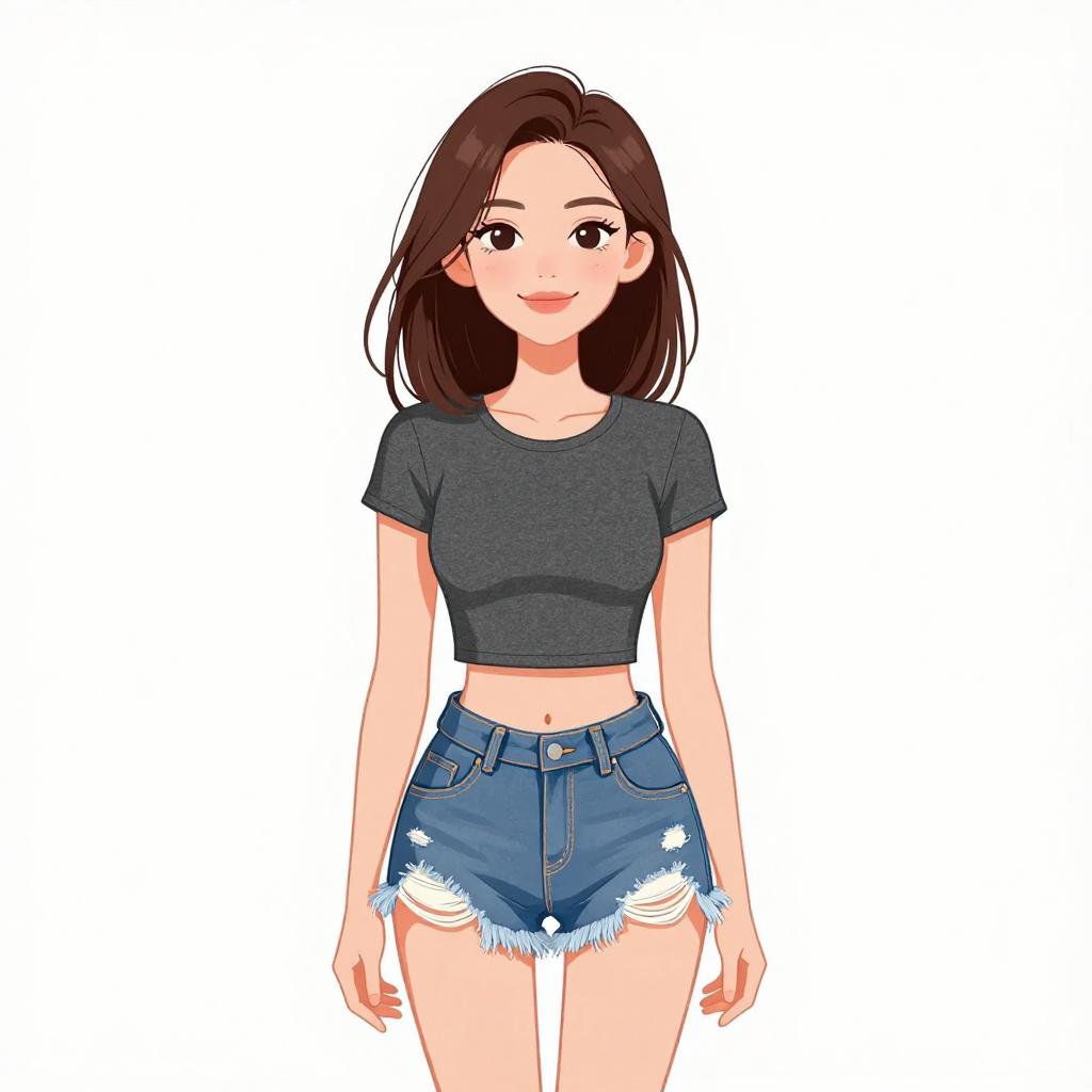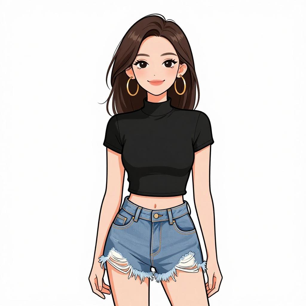 Woman with pretty face and pretty hair. smiling Woman, casual streetwear, oversized acid-wash pink cropped t-shirt with a pocket detail, high-waisted distressed denim shorts, large silver hoop earrings, simple makeup, white background --sref 1467