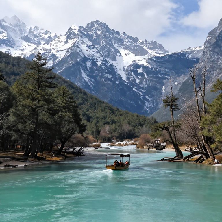 A majestic river at the base of a snowy mountain peak, with turquoise waters flowing past ancient trees and a small boat drifting gently on the surface.
