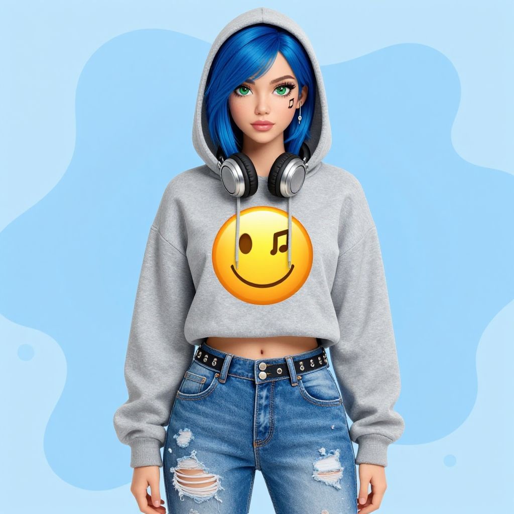 Stylized full-body illustration of a young woman with blue hair wearing a grey hoodie featuring a yellow emoji graphic with headphones. She has bright green eyes, a music note face tattoo, and is dressed in lightly distressed blue denim jeans with a high waist and button closure. The outfit is complemented by large headphones around her neck and a studded belt. The image has a comic-inspired, realistic face style on a soft blue abstract background.