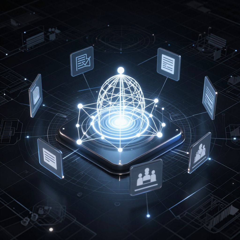 Deel platform depicted as an elegant, glowing network hub in the center of a dark technological grid, surrounded by floating icons representing payroll, contracts, and remote teams, detailed cyber network visualization, sleek and minimalistic