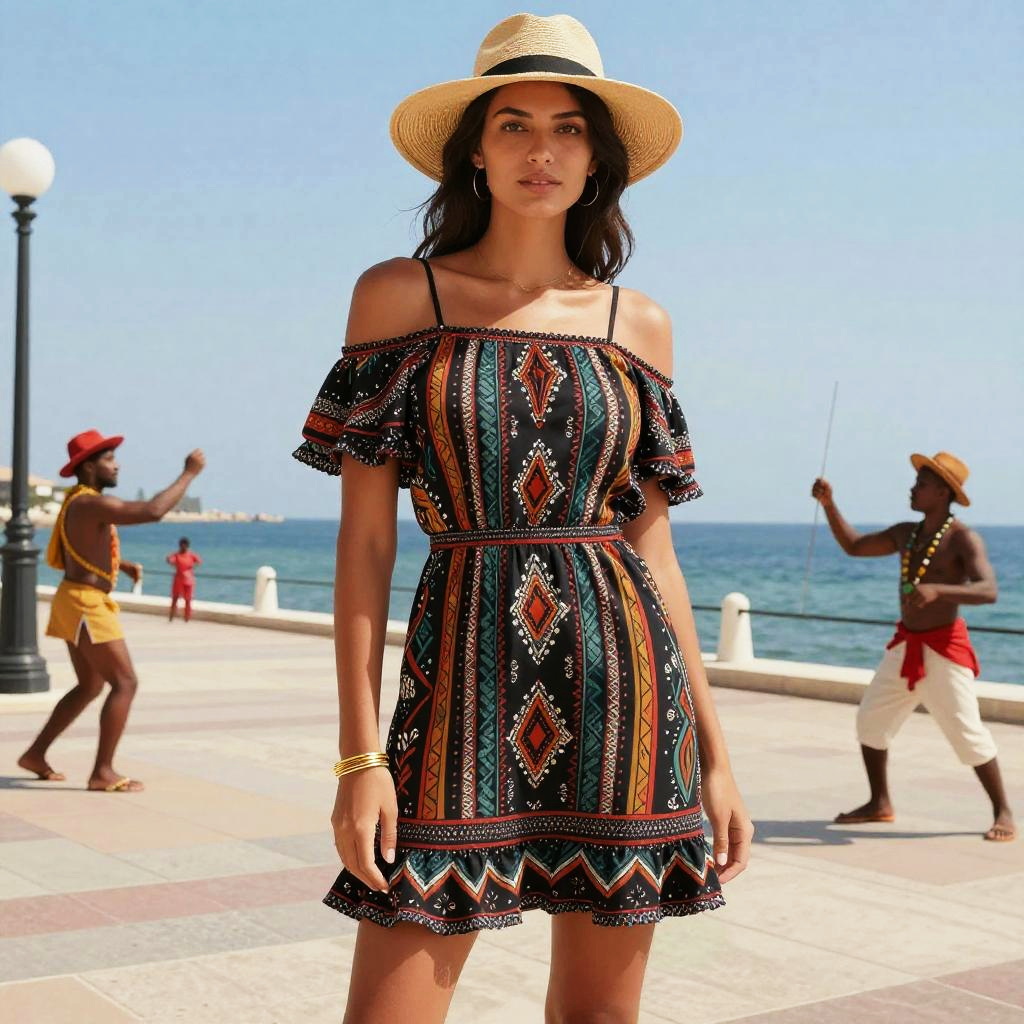 A tall woman in a boho chic black mini dress featuring a colorful tribal print, short cold-shoulder sleeves, and ruffle accents, accessorized with a straw fedora hat and a gold bracelet, stands at a seafront promenade with street performers, illustrated in the style of Antarctic Press. Sexy. Pretty face and beutiful eyes