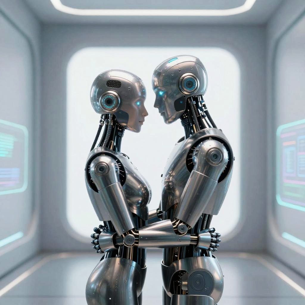A CGI image depicts two humanoid robots with shiny, metallic bodies standing in a futuristic, white-walled room with blue-lit panels. The robots, facing each other, have blue glowing eyes and are embracing with arms around each other's waists. Their heads are tilted slightly, and they appear to be in a tender moment. The background features a bright, rectangular light source, creating a stark contrast with the robots' reflective surfaces. The scene has a sci-fi aesthetic, emphasizing a sense of intimacy and connection between the two robotic figures.