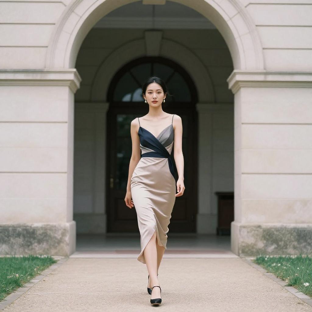 A woman in an elegant gown with an analog film aesthetic walks gracefully along a classic archway, exuding sophistication and style. The soft lighting and serene environment enhance the timeless beauty of the scene.