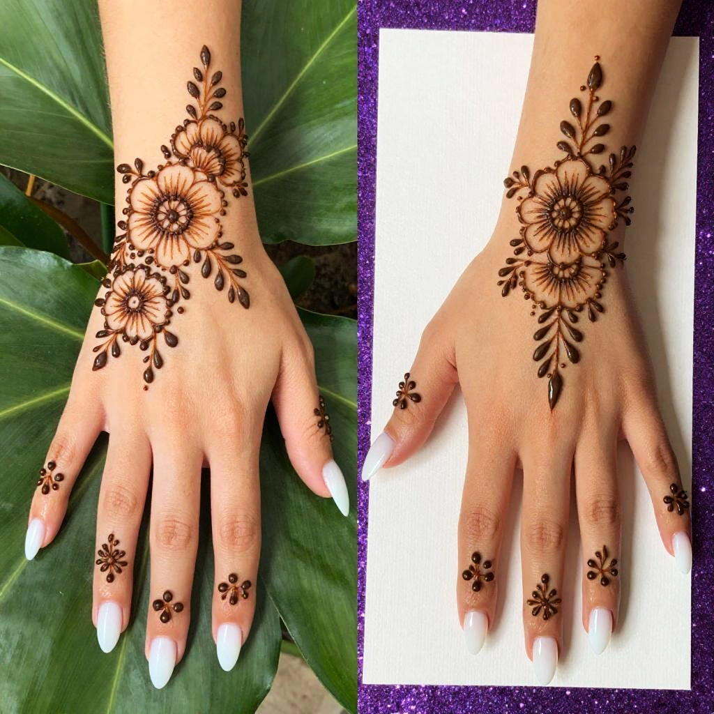 Photograph of a light-skinned hand with long, almond-shaped, orange-red nails. The hand is adorned with intricate brown henna patterns and a fishnet design on the back. It wears a silver ring with a small, clear stone on the middle finger. The background shows a window with white geometric frames and a tiled floor. The image has a watermark in the bottom left corner.
