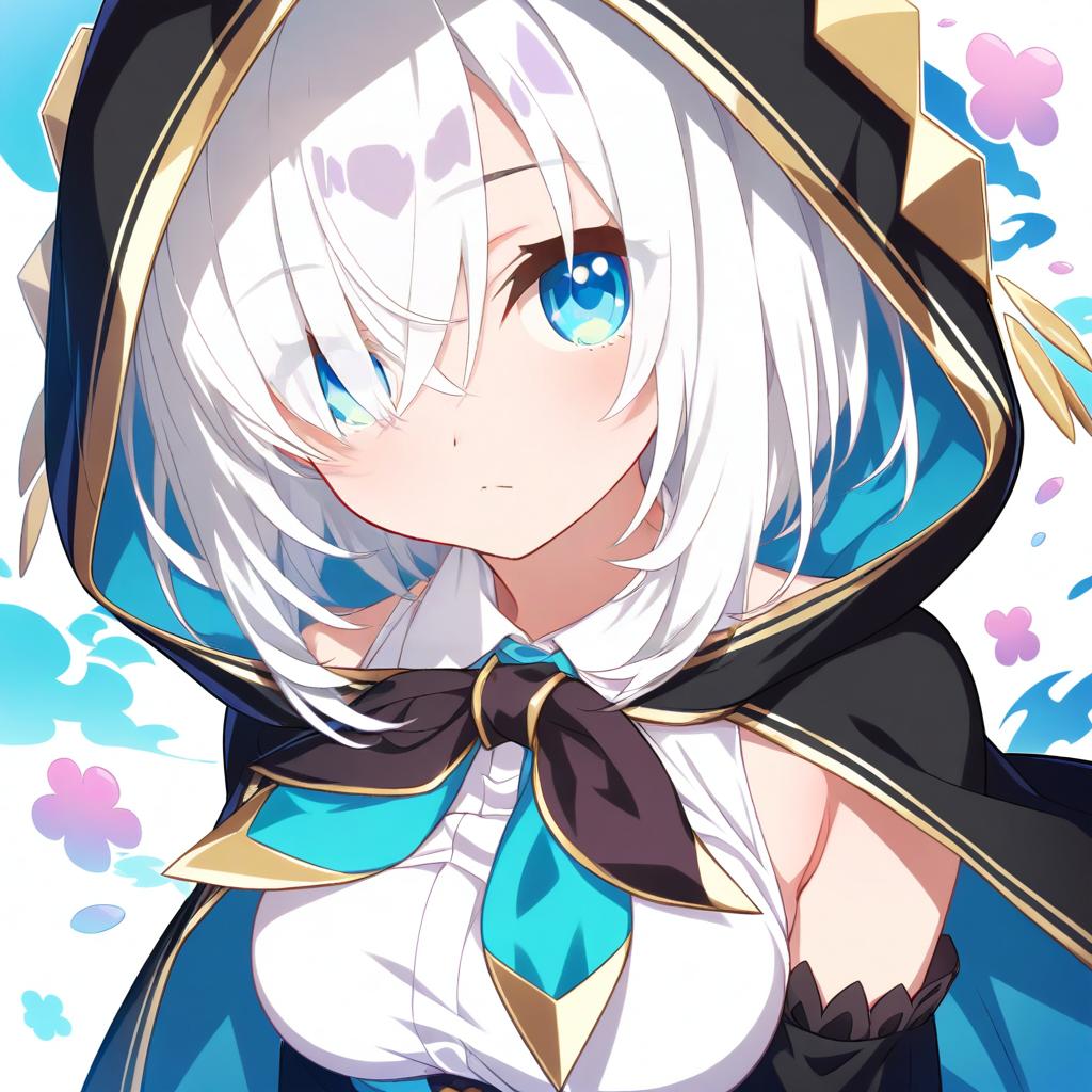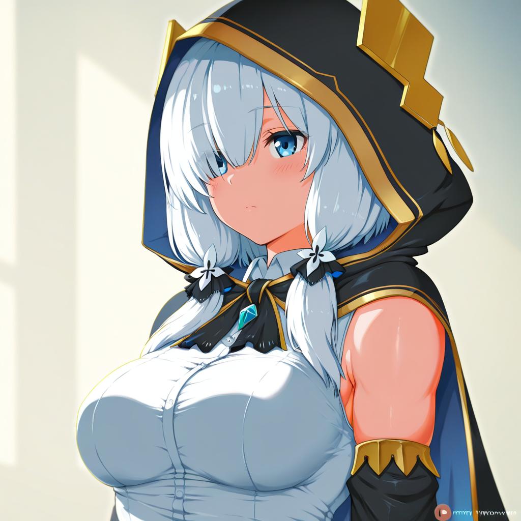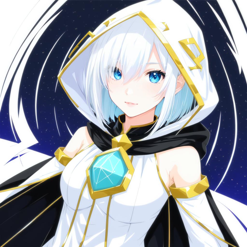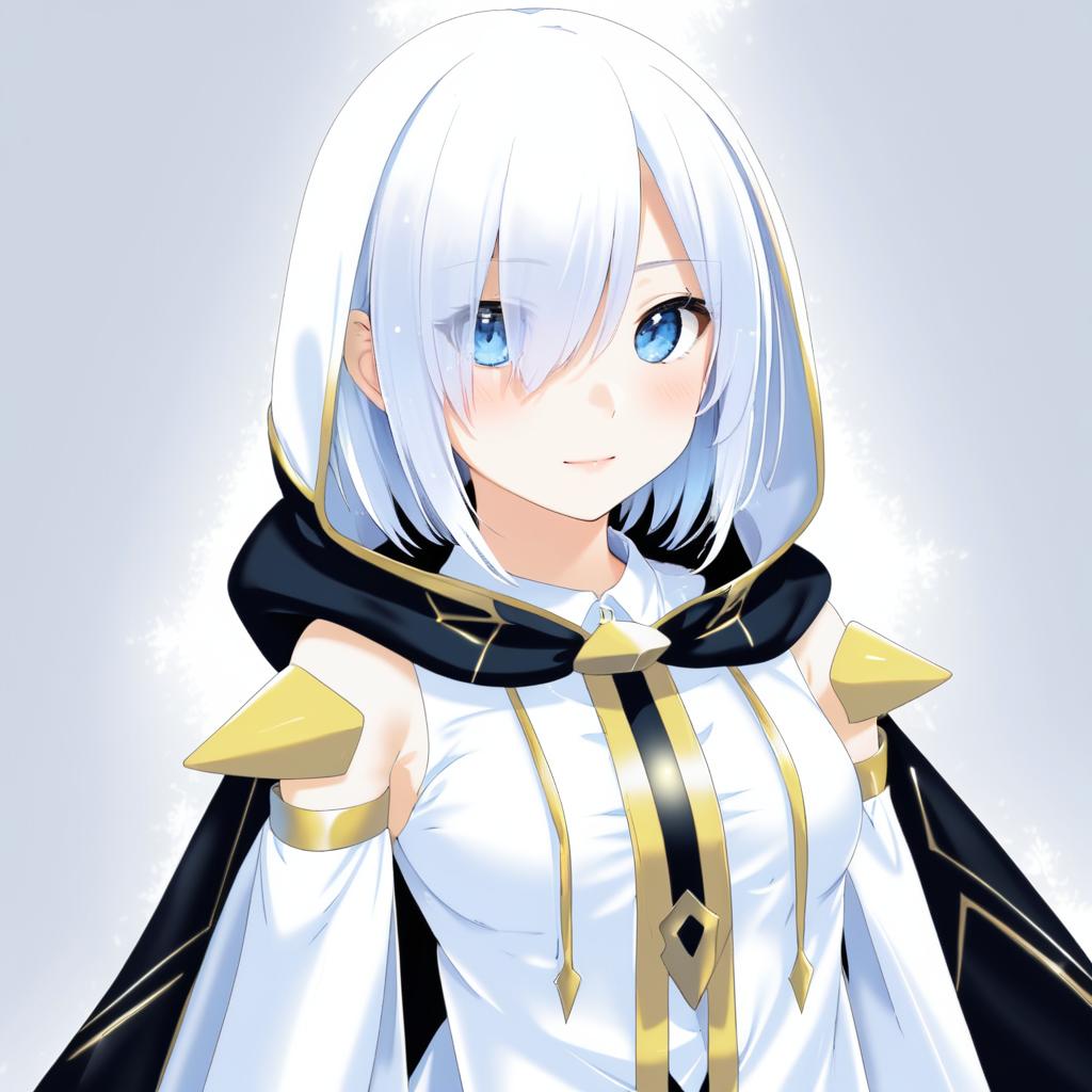 Ars almal (1st costume), nijisanji, 1girl, blue eyes, hair between eyes, hair over one eye, white hair, short hair, medium breasts, white shirt, hooded cape, black cape, sleeveless shirt, detached sleeves, hood up, virtual youtuber, virtual youtuber, by artist aoi kumiko, animagine