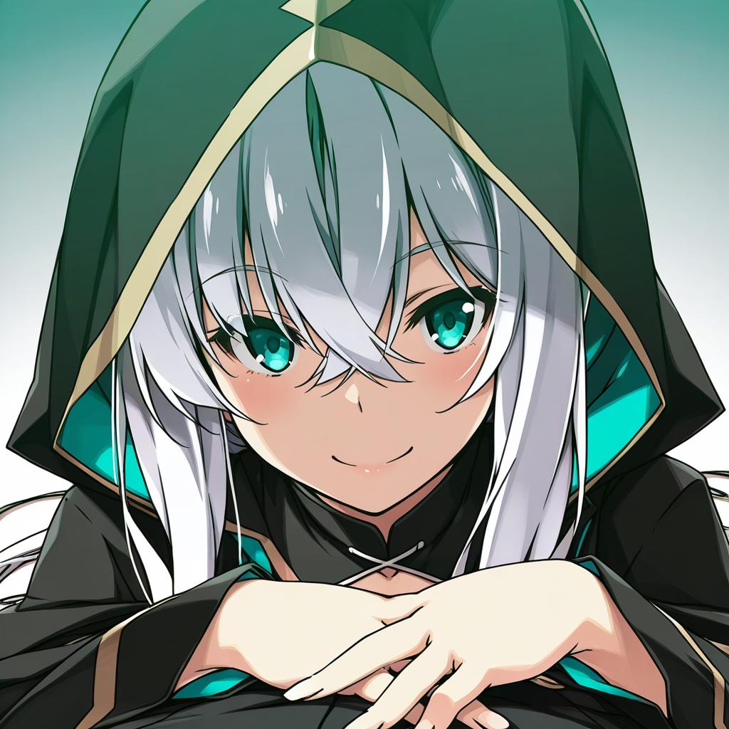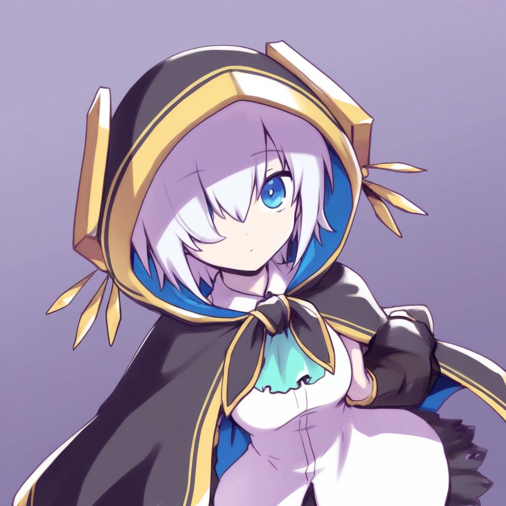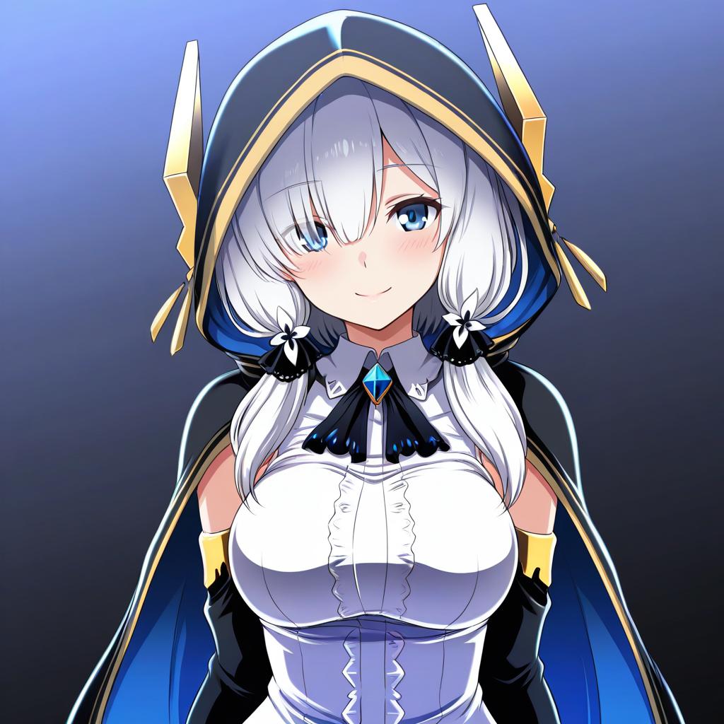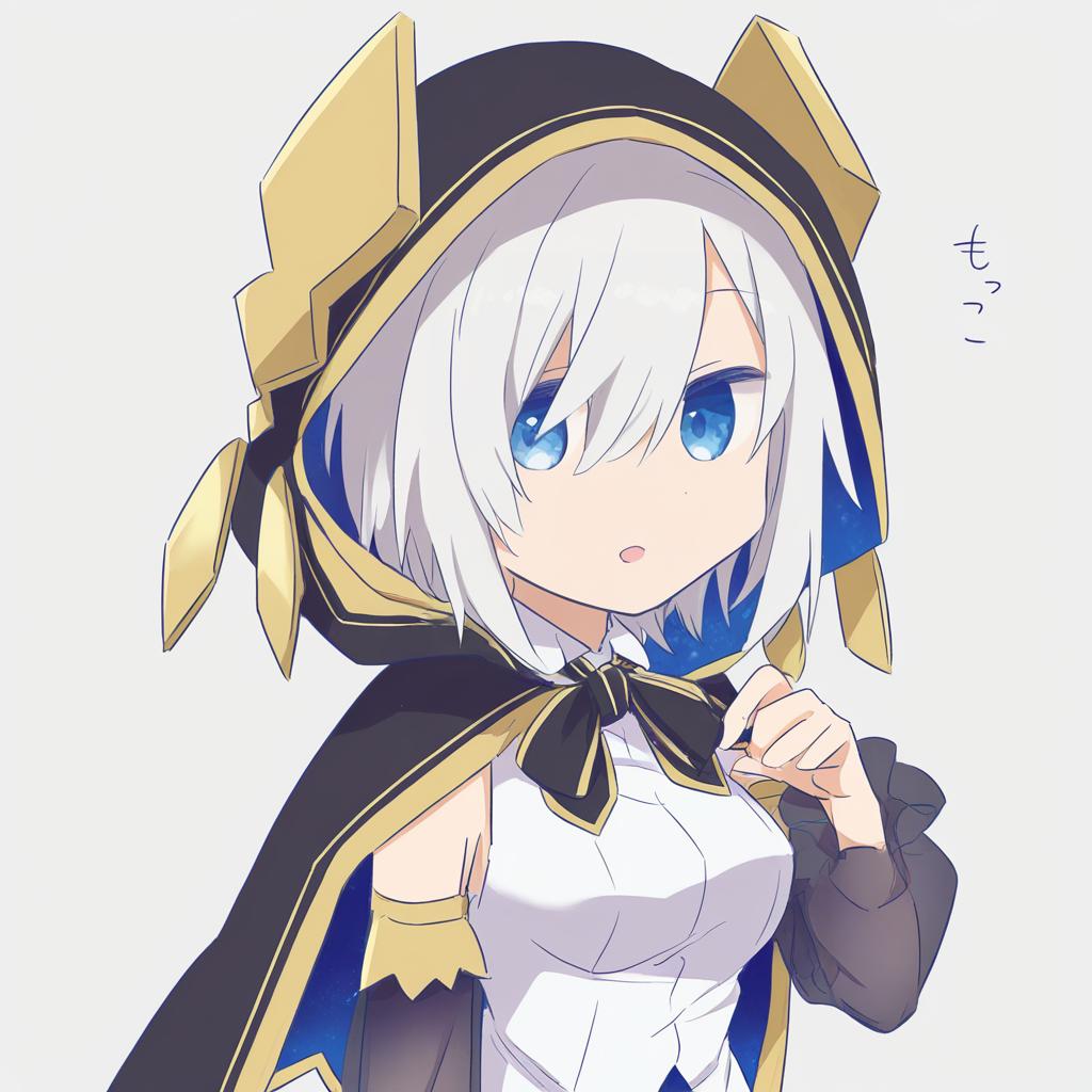 Ars almal (1st costume), nijisanji, 1girl, blue eyes, hair between eyes, hair over one eye, white hair, short hair, medium breasts, white shirt, hooded cape, black cape, sleeveless shirt, detached sleeves, hood up, virtual youtuber, virtual youtuber, by artist aoi kumiko, animagine