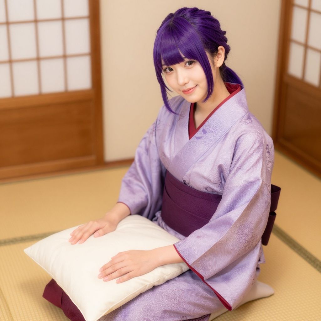 Digital anime drawing of a cute, purple-haired girl in a blue and white kimono, kneeling on tatami mat with a purple pillow, inside a