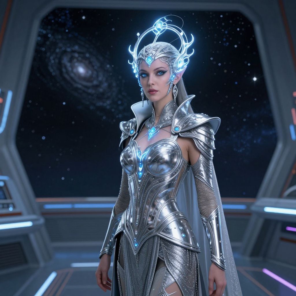 Aulra, an elegant alien queen with elaborate silver armor and intricate headpiece glowing with energy, commanding a starship bridge overlooking a distant galaxy, science fiction theme