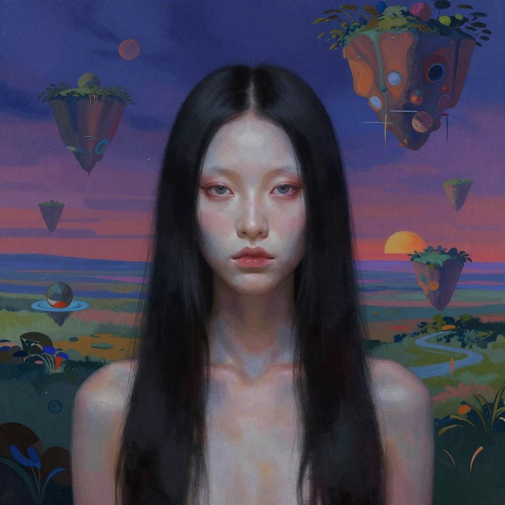 Painting of a woman with onyx-textured skin, slim, tall, dressed in black with a scarf around her neck, set in a nighttime forest scene in the style of Hieronymus Bosch.