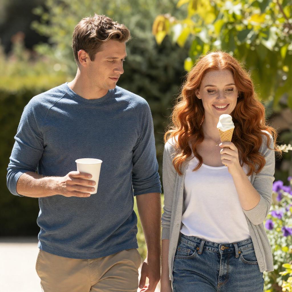 Photograph of a couple walking in a garden. Man with short brown hair, grey-blue raglan shirt, holding a cup, looking down. Red-haired woman with wavy hair, grey cardigan, white top, jeans, smiling, holding ice cream. Green foliage, yellow leaves, purple flowers in background. Woman on right, man on left, both smiling. Woman looking at ice cream. Bright, sunny day.