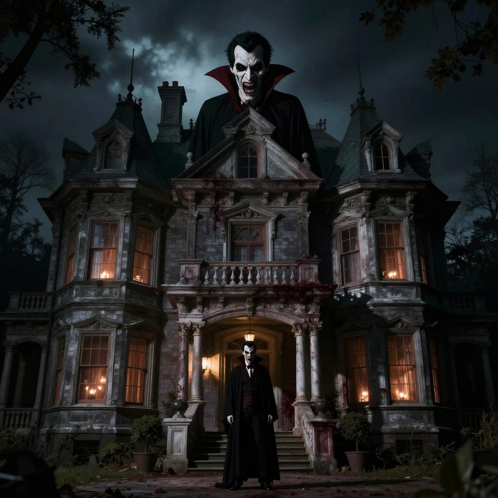 Realistic photo.horror movie poster featuring a bloodthirsty vampire lurking in the shadows of an old mansion realistic photo