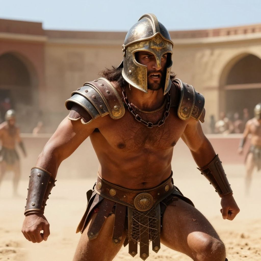 RAW photo, photorealistic, solo, upper body, looking away, detailed background, detailed face, totempunkai, inca theme:1.1), gladiator, pit-fighter, charging, taunting expression, broken chains, net, Brown gladiator armor, greaves, shoulder armor, helmet, arena in background, dust, sunshine, intense gladiatorial atmosphere, (Masterpiece:1.3) (best quality:1.2) (high quality:1.1)