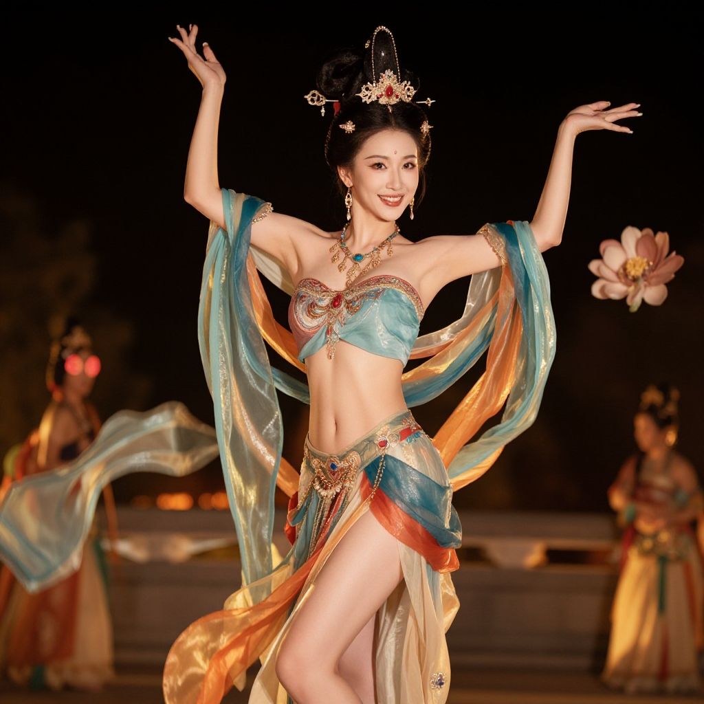 (goddess-like happiness, flirtatious, seductive:1.4), (RAW photo:1.2), (photorealistic:1.6), (ultimate quality, masterpiece:1.3), (intricate details:1.2), (detailed face:1.2), dramatic, ray tracing, fashion photograph, fFaceDetail, Full body, good hands, Sharp focus, cinematic lighting, ohwx, ohwx woman, (dunhuang, dunhuang_face, Chinese Dunhuang Flying Fairy, floating clothes, floating flower, pov legs, thighs, dunhuang cloths, hanfu, waist cape, strapless, navel, robe:1.2), (1girl, solo, outdoors, night time, dancing:1.6), confident smile, beautful face, (large breasts, narrow waist:1.2), sexy body, perfect body, shiny hairs, hair ornament, earrings, necklace, jewelry, confident, showcasing, buzzing atmosphere