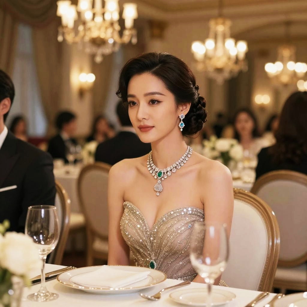 An elegantly dressed woman with a sophisticated hairstyle and sparkling jewelry, sitting at a dinner table set for a formal event. The setting is luxurious, with chandeliers and ornate decor enhancing the opulent atmosphere.