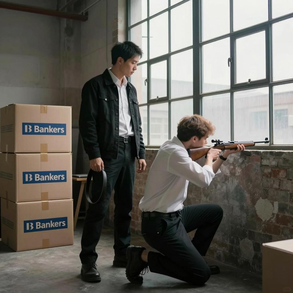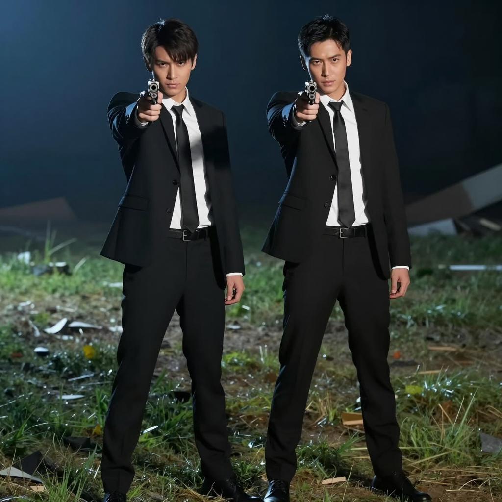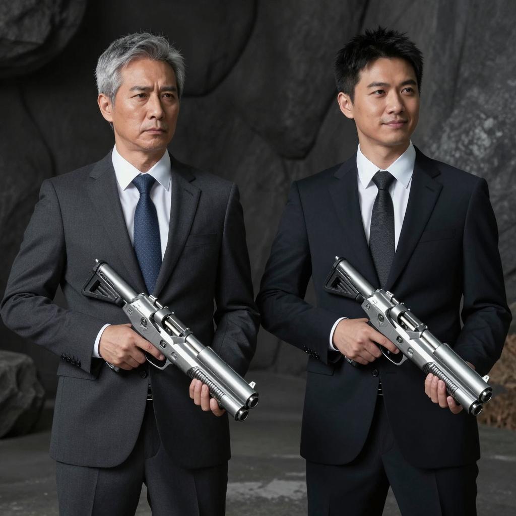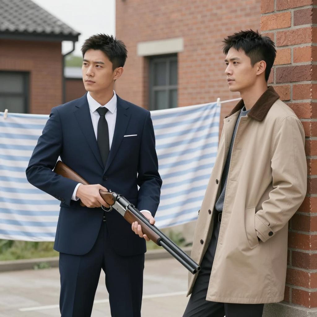 Two young Asian men outdoors by a brick wall and two brick buildings. The man on the left wears a dark blue suit with a black tie and holds a shotgun. The man on the right is leaning against the brick wall wearing a beige coat over a gray shirt. A blue and white striped cloth hangs on a laundry line in the background. Both men have short black hair and serious expressions.