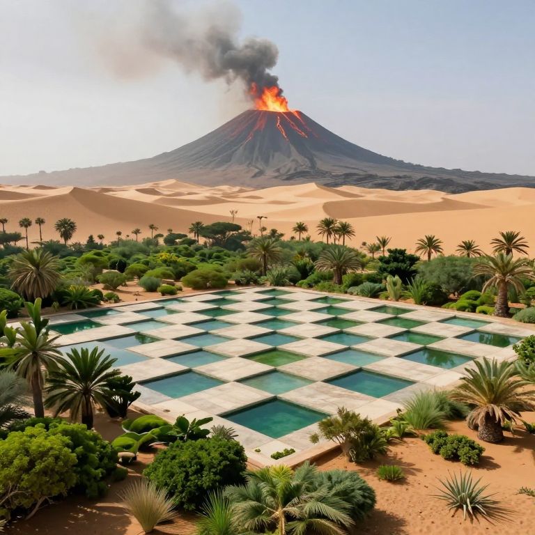 In a surreal desert landscape, a checkerboard of life and chaos unfolds—a sanctuary of vibrant greenery and calm waters contrasts sharply with the fiery eruption of a volcano and the smoky whispers of distant dunes, evoking a paradoxical dance between serenity and turmoil, hope and transience.