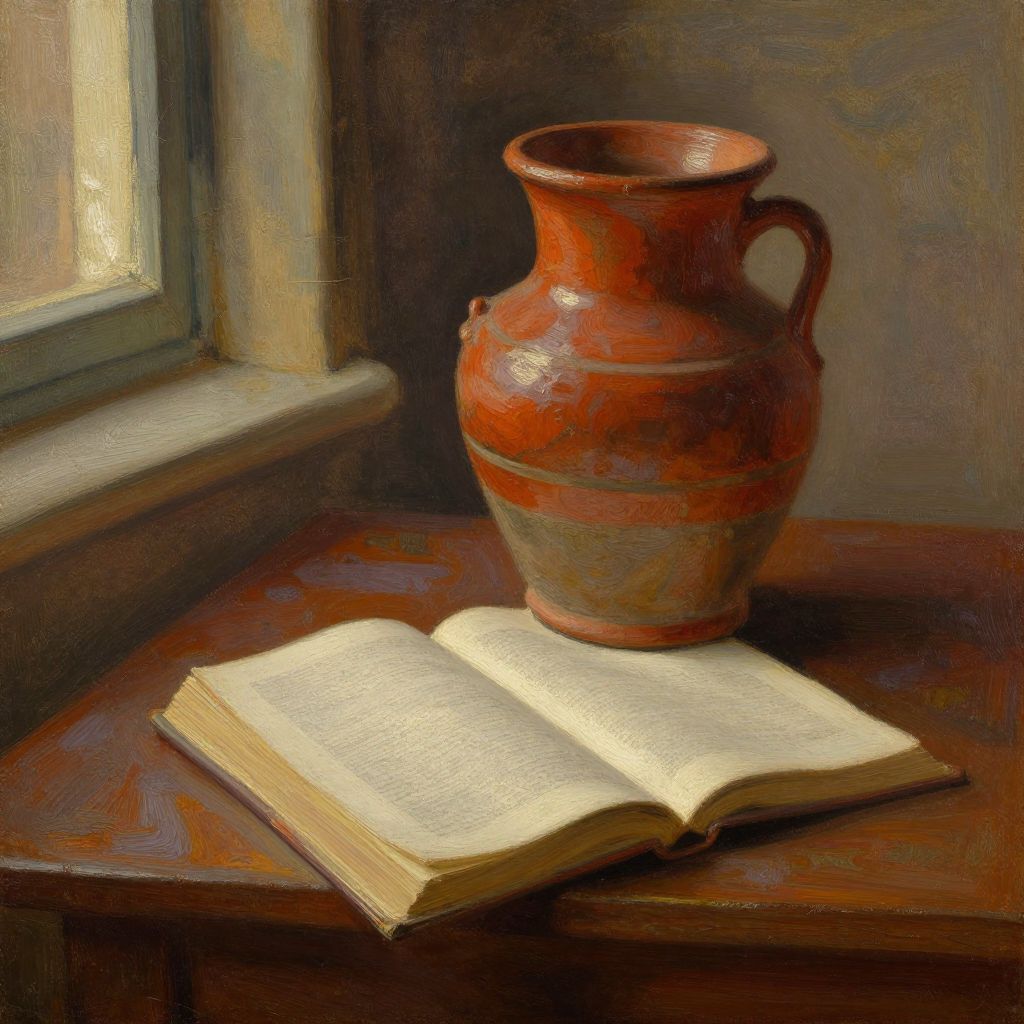 Appl depicted as a vintage still life composition, classic oil painting style, rich warm tones, textured brushstrokes, placed beside rustic pottery and an old book, soft natural lighting from a window, timeless and elegant mood.