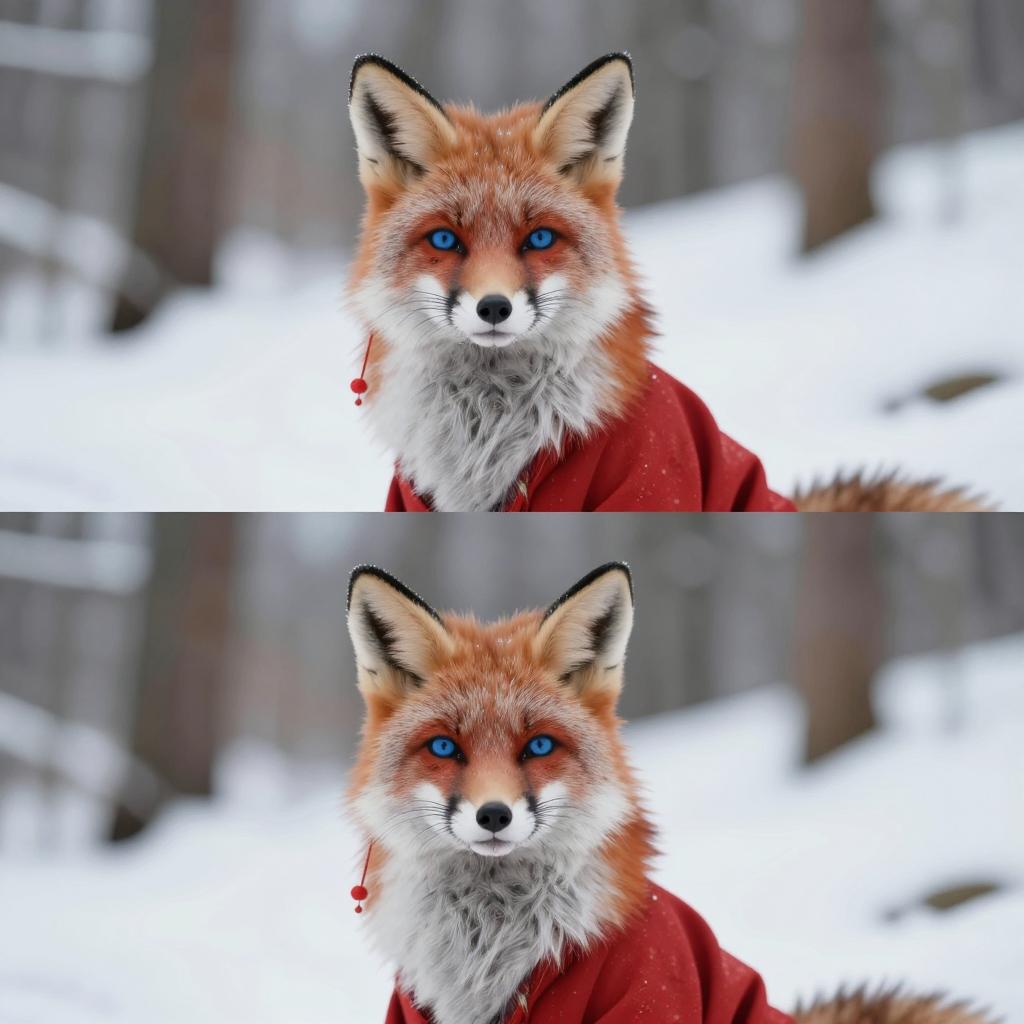 Fox-like creature with red-orange fur, blue eyes, and white muzzle. Wearing a red robe with white fur collar, seated on snowy ground. Background: snow-covered trees, green pine bushes. Two identical images stacked vertically. Creature's head slightly tilted, direct gaze. Light brown rope around neck, small decorative bead. Snowy ure visible.