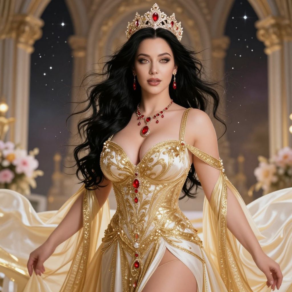 A stunning woman with long, flowing black hair and a majestic crown on her head, her eyes glowing with serene elegance. She has a voluptuous figure with big tits and a sexy, alluring presence. She is wearing a luxurious gold and white dress adorned with intricate gold embroidery, flowing beautifully around her, and a striking red necklace that catches the light. The setting is a magical, ethereal palace under a starry night sky, with soft golden light and delicate floral details in the background. Her expression is confident and powerful, exuding grace and mystery.