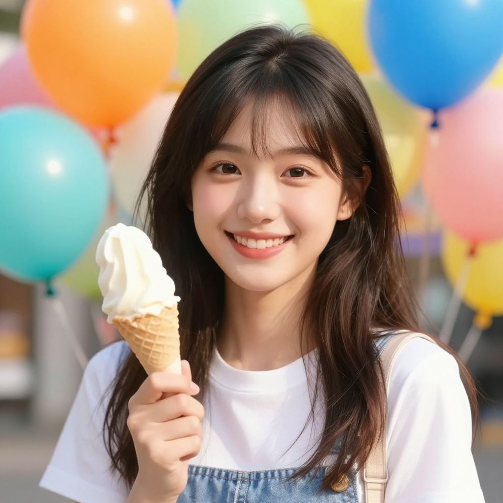 (masterpiece, best quality), HDR, high-definition, Intricate Details, vray render, octane render, 1girl, happy smile, holding ice cream, many colorful balloons background
