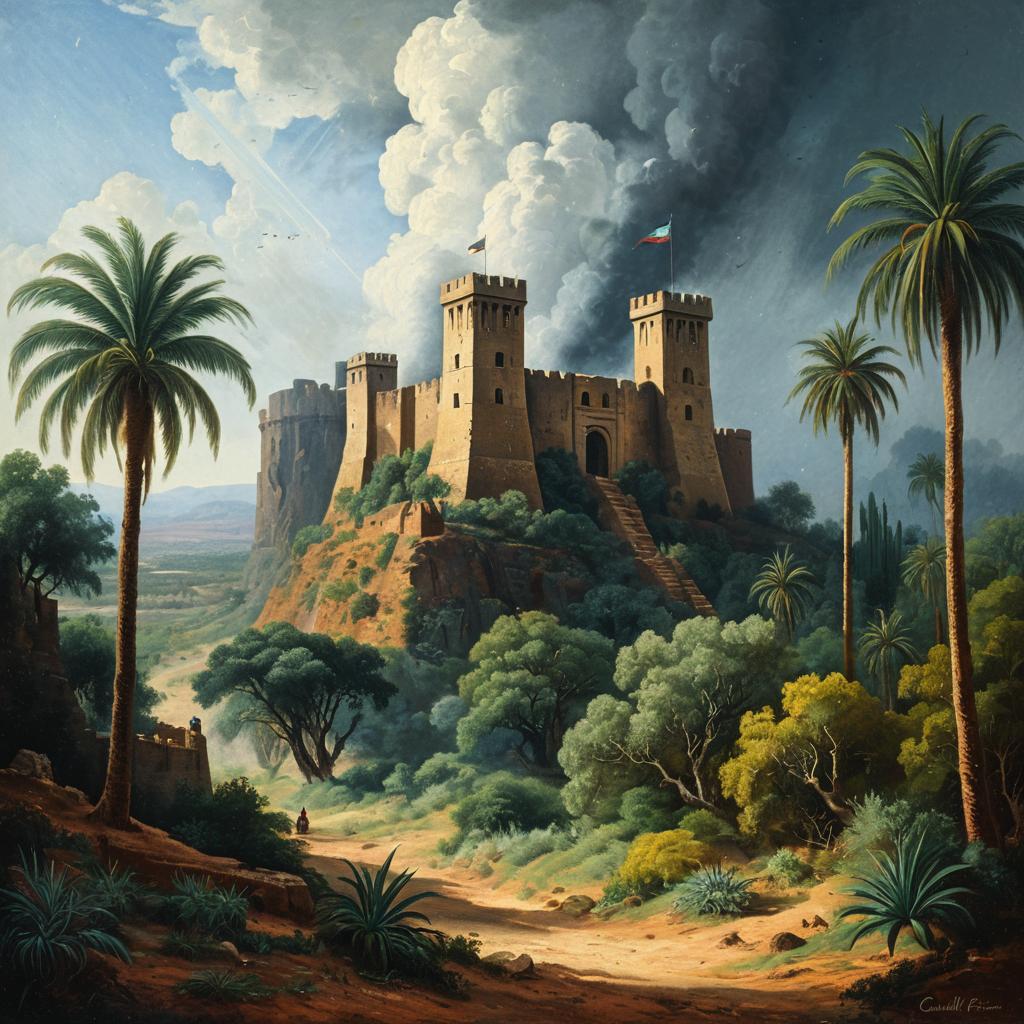 A detailed painting depicting an ancient stone fort with multiple round towers situated atop a rocky, lush hill surrounded by dense tropical vegetation and palm trees. The landscape includes desert scrub, forest elements, and a cloudy sky with mist and smoke in the background, evoking a folkloric and symbolic tropical atmosphere reminiscent of styles by Camille Pissarro and Frederick Edwin Church.