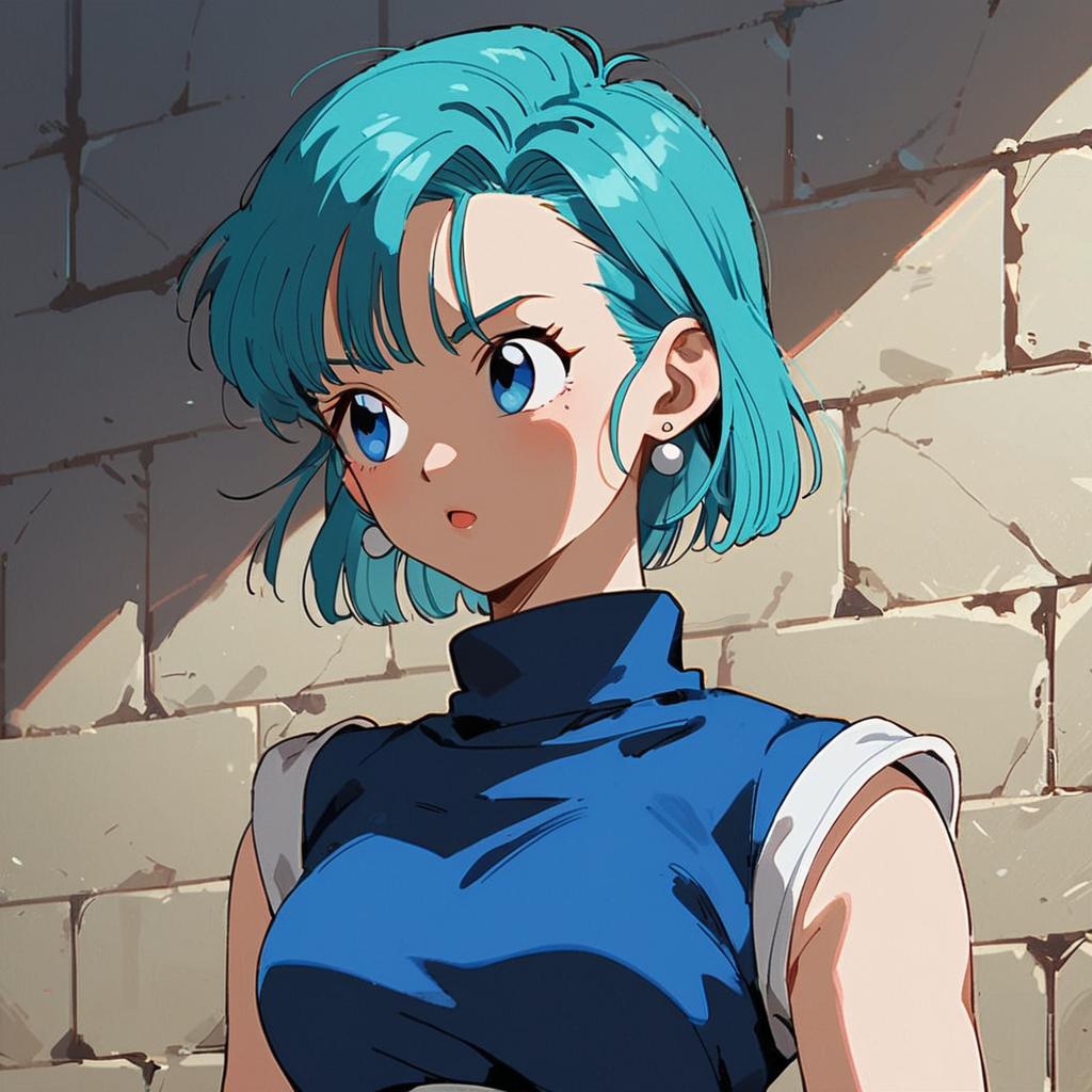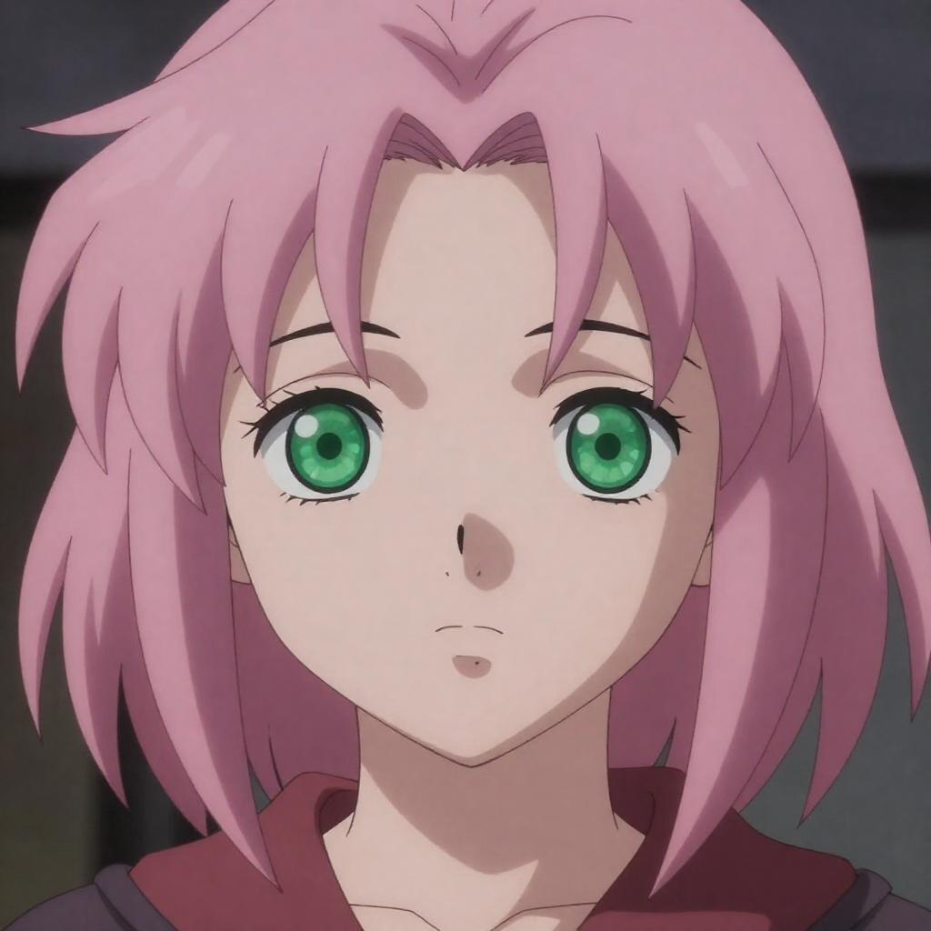 Anime style fantasy character with teal skin and long black hair, wearing a pink shirt, standing in a city street at sunset, vibrant colors, detailed shading, expressive red eyes, fantasy elf character with pointed ears, soft glowing light, urban background