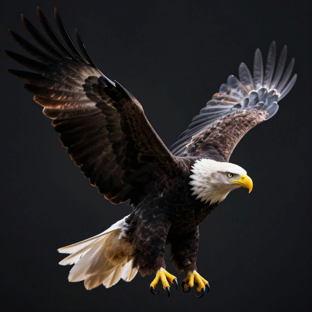 A majestic bald eagle with wings spread wide, descending with claws extended, dramatic dark background with high contrast lighting highlighting the feathers, realistic style, intense shadows, black and white color scheme with yellow color on the beak and claws, subtle glowing light effects around the wings