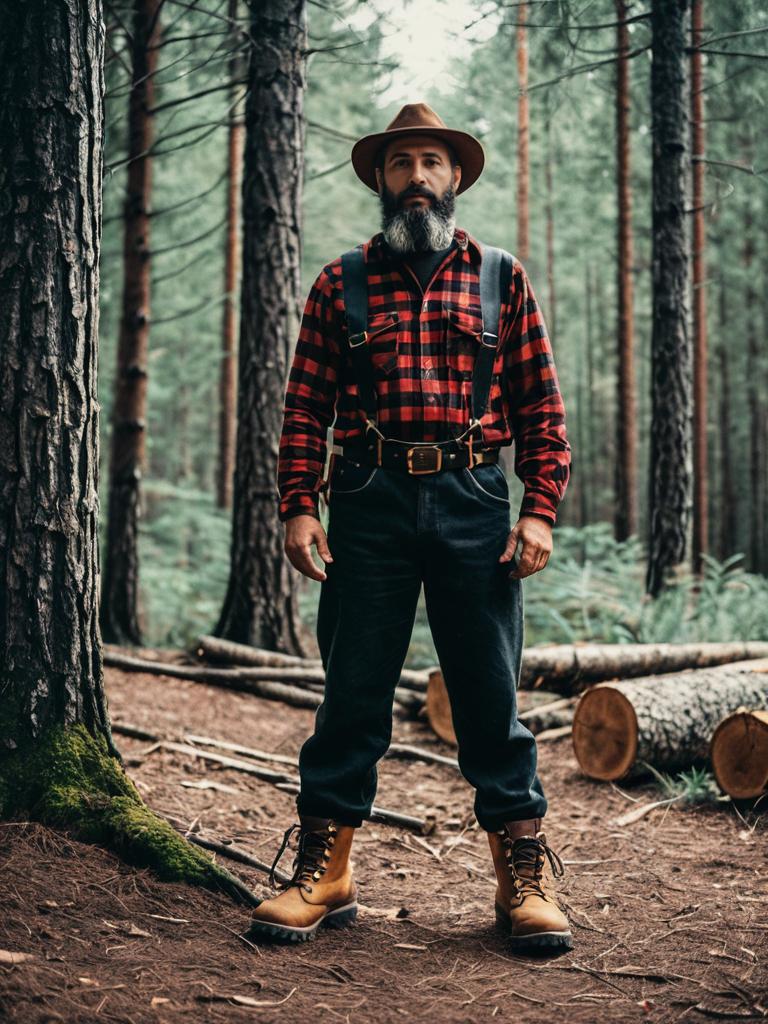 Man in Lumberjack Costume, photorealistic outdoor portrait with forest backdrop