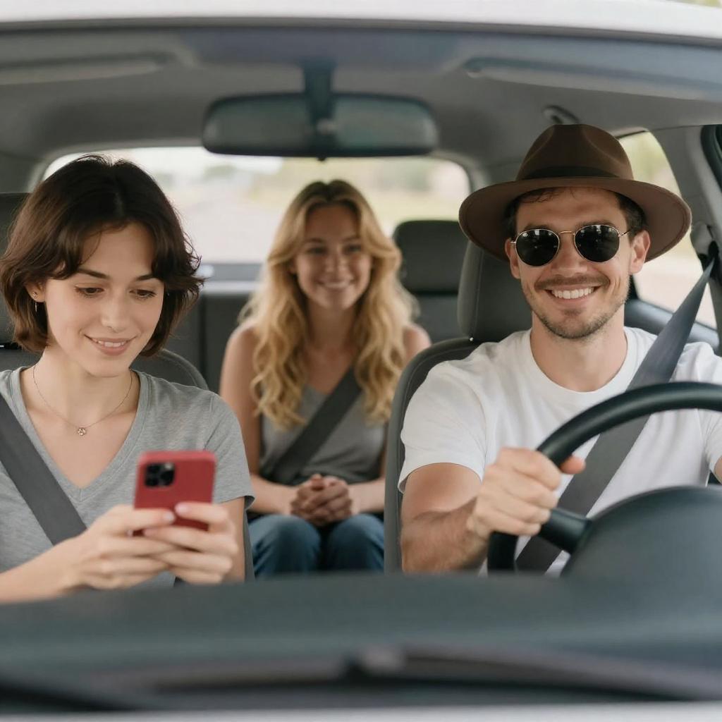 Photograph of a man and woman in a convertible car. Man on left, gray suit, white shirt, black tie, slight smile. Woman on right, blonde hair, pink dress, steering wheel, calm expression. Background: road, trees, house. Sunlight reflects on car windshield.
