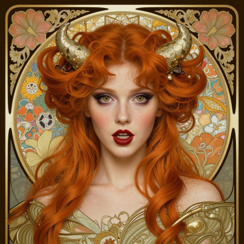 Digital portrait of a fair-skinned woman with striking, wavy, vibrant red hair and blue eyes. Her expression is neutral, with slightly parted lips. She is centered in the image, framed by an ornate, golden Art Deco-style border with symmetrical patterns. The background is a muted teal, which contrasts with the gold and her red hair. The intricate border features radiating lines and fan shapes, adding a sense of elegance and sophistication to the composition. The image has a hyper-realistic style, with detailed textures in her hair and skin.