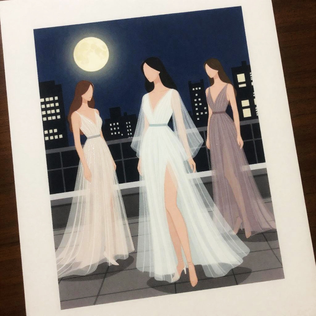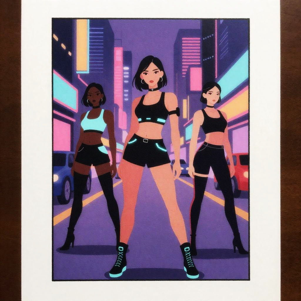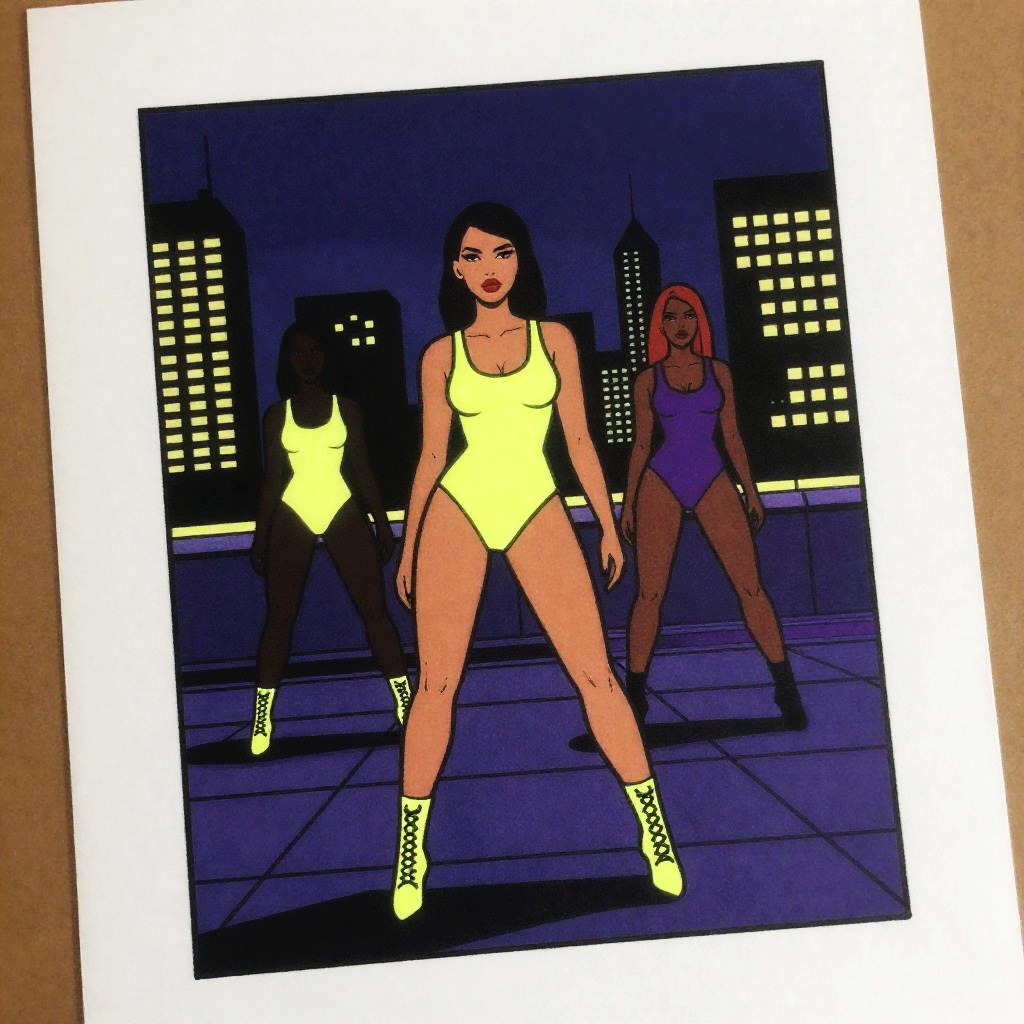 On parchment, colored inked, comics, graphic novel illustration, flat colors, woman, neon rave on a rooftop helipad at night. Capture models showcasing glowing neon bodysuits in the heart of the city.