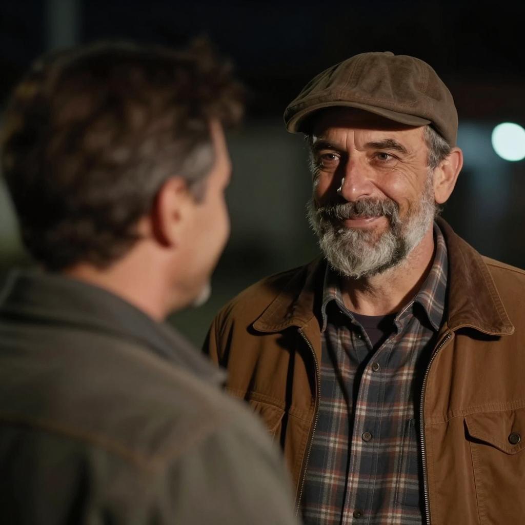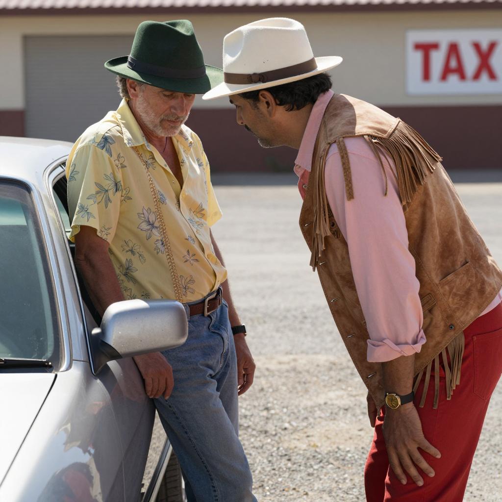 Two men near a car. The man inside wears a green hat, yellow shirt with floral patterns, and blue jeans. The man outside leans in, wearing a white hat, fringed leather vest, pink shirt, and red pants. Sunlight illuminates the scene. Background includes a gravel lot and a building with a "TAX" sign.