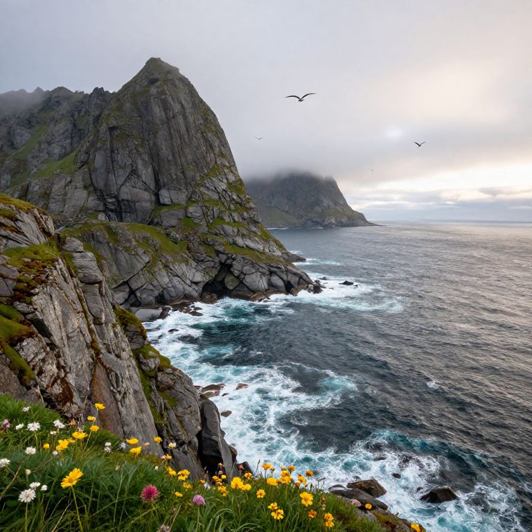 Lofoten coastline with wild rugged cliffs plunging into turbulent ocean waves, sea birds soaring overhead, bright wildflowers at edge of cliff, early morning mist with soft lighting, expansive panoramic view, vivid natural colors, epic wilderness vibe
