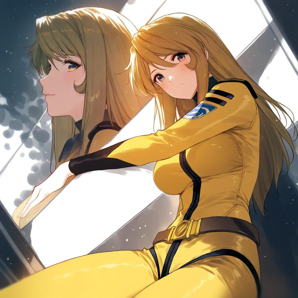 Mori yuki, uchuu senkan yamato, 1girl, brown eyes, purple eyes, long hair, blonde hair, brown hair, medium breasts, large breasts, yellow bodysuit, by artist caidychen, animagine