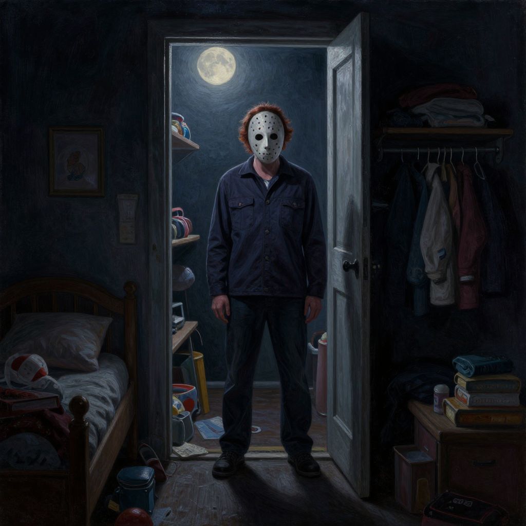 Photograph of a man standing in a dimly lit bedroom doorway at night, illuminated by moonlight. He wears a white, horror-style mask with red hair, a dark blue button-up shirt, and black pants. The room is cluttered; a bed with disheveled sheets is on the left, a closet with hanging clothes is on the right, and shelves with various items are in the background. The door is open, revealing a bright full moon outside. The scene is dark, with strong contrasts between the moonlight and shadows.